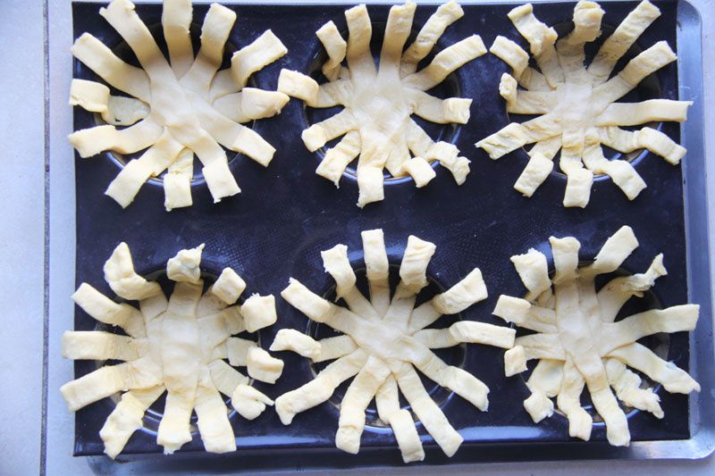- Détailler la pâte en 36 bandes de 1 cm de large sur 20 cm de long. Croiser 6 bandes de pâte dans chaque empreinte.