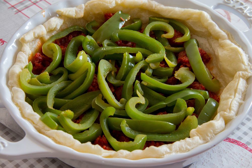 C’est parti pour la recette de cette quiche au chorizo et aux poivrons verts …